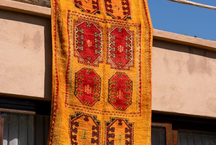 Striking portrait with traditional jewelry on a black-gold fabric. Ideal for bold, artistic interiors.