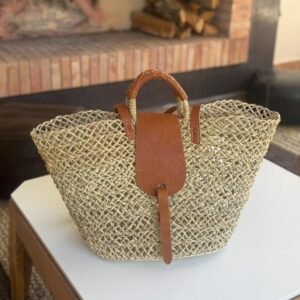 Dimensions: 20”x18”. Handwoven in Morocco, this open-weave straw tote features leather handles and straps for a refined, authentic Moroccan finish.